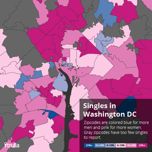 Very few zip codes have more single men than single women, but there are a couple; in 20004 — Penn Quarter — and 20006, south of Farragut, men barely edge out women, with ratios of 1.04 and 1.02, respectively.