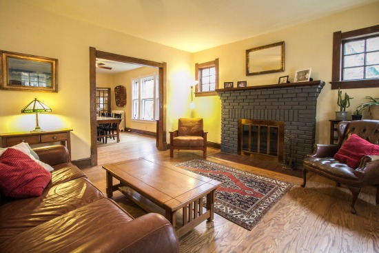 Inside, the first floor has the dark woodwork typical of a bungalow. The living room opens to both a large dining room and kitchen; the rooms flow in a circular manner, which makes entertaining easy, said Killeen.