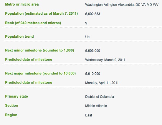Business First uses an in-house computer program that projects the population of metro areas by analyzing demographic trends over the past decade. (UrbanTurf is looking for a more detailed explanation of its methodology.) The screen shot below shows that it provides new estimates almost daily. (By Wednesday, there will be a few more hundred people in the area.)