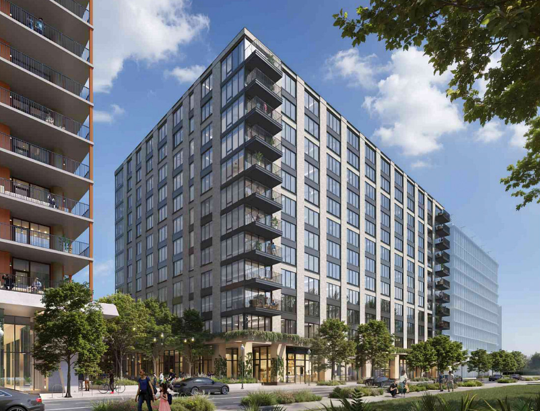 A courtyard between this new building and the first phase of Bridge District will have retail and outdoor dining areas as well as residential amenity space and garden patio areas. A pedestrian walkway will run through the center of the courtyard.