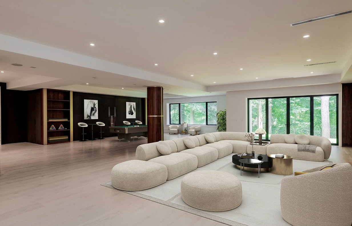 For example, there is a great room with 28-foot ceilings and a lower level meant for entertaining, complete with a cinema, a glass enclosed wine cellar, and over 3,000 square feet of recreation space. The home also has a gym with a dry sauna and steam room, as well as a large outdoor pool with a waterfall and two fire pits.