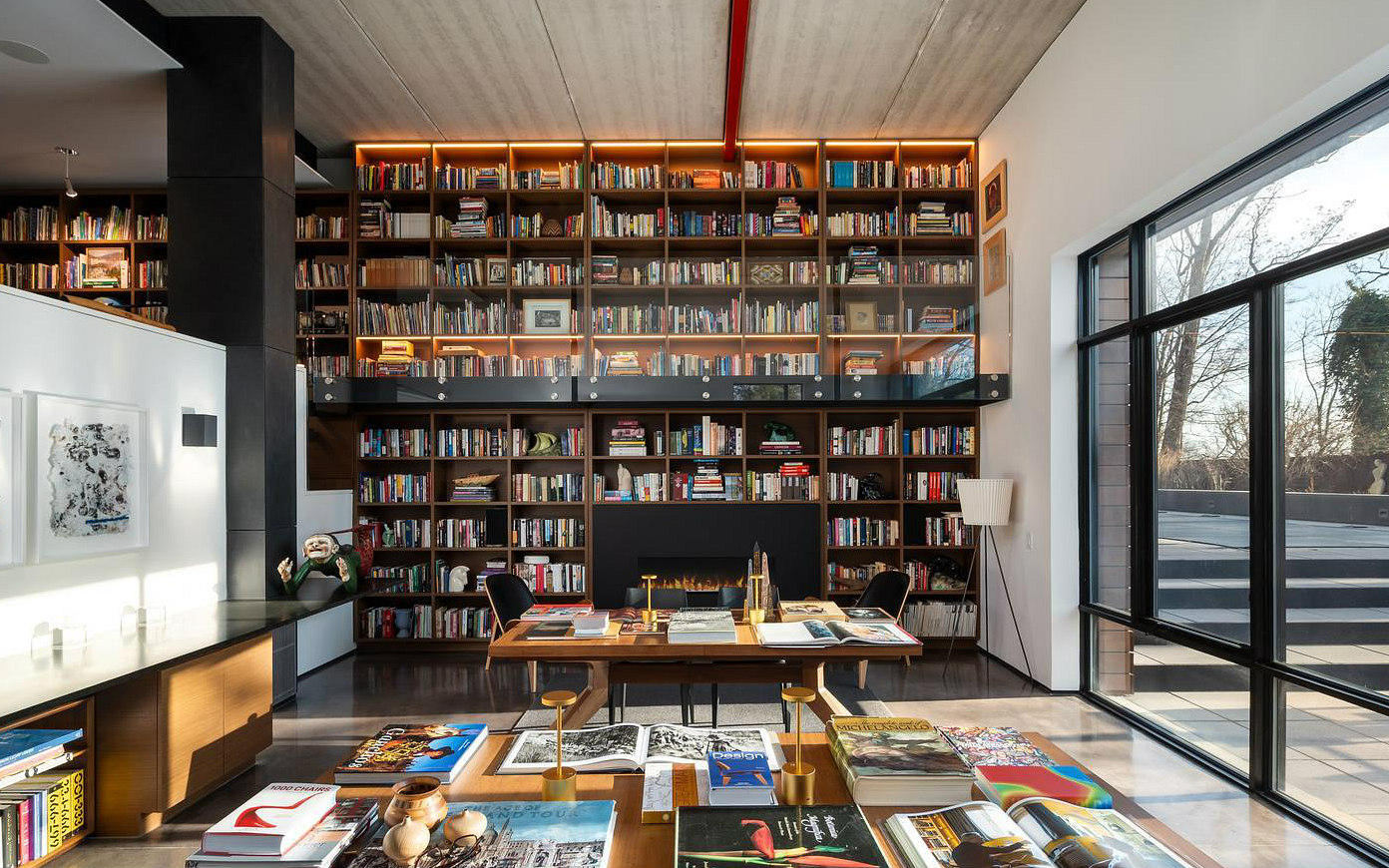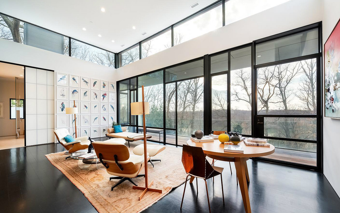 Inside, the main living area pairs Mondrian-inspired steel window frames and white terrazzo floors and sweeping Potomac views. This level also includes a chef's kitchen backed by a full butler's pantry, as well as a screened-in porch with a fireplace and a three-level elevator.