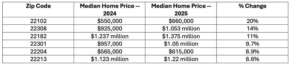 The Vienna zip code of 22182, with its particularly large houses, saw prices rise by 11%. Rounding out the list are the Alexandria zip code of 22301 and the Arlington zip codes of 22204 and 22213.