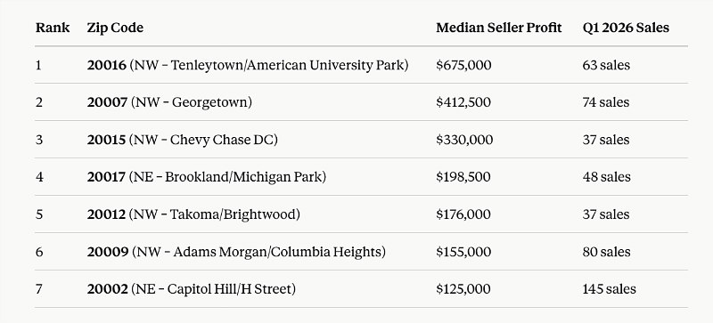 New data from ATTOM covering the first quarter of 2026 shows that sellers in the zip code that includes Tenleytown, Spring Valley and American University Park netted a median profit of $675,000, more than $260,000 above second-place Georgetown (20007), where sellers pocketed a median $412,500. Rounding out the top three is 20015 (Chevy Chase, Barnaby Woods) with a median seller gain of $330,000 on 37 transactions.