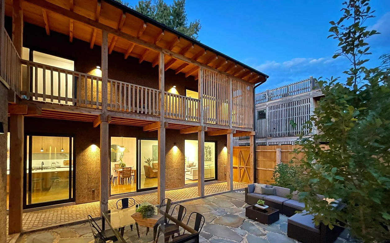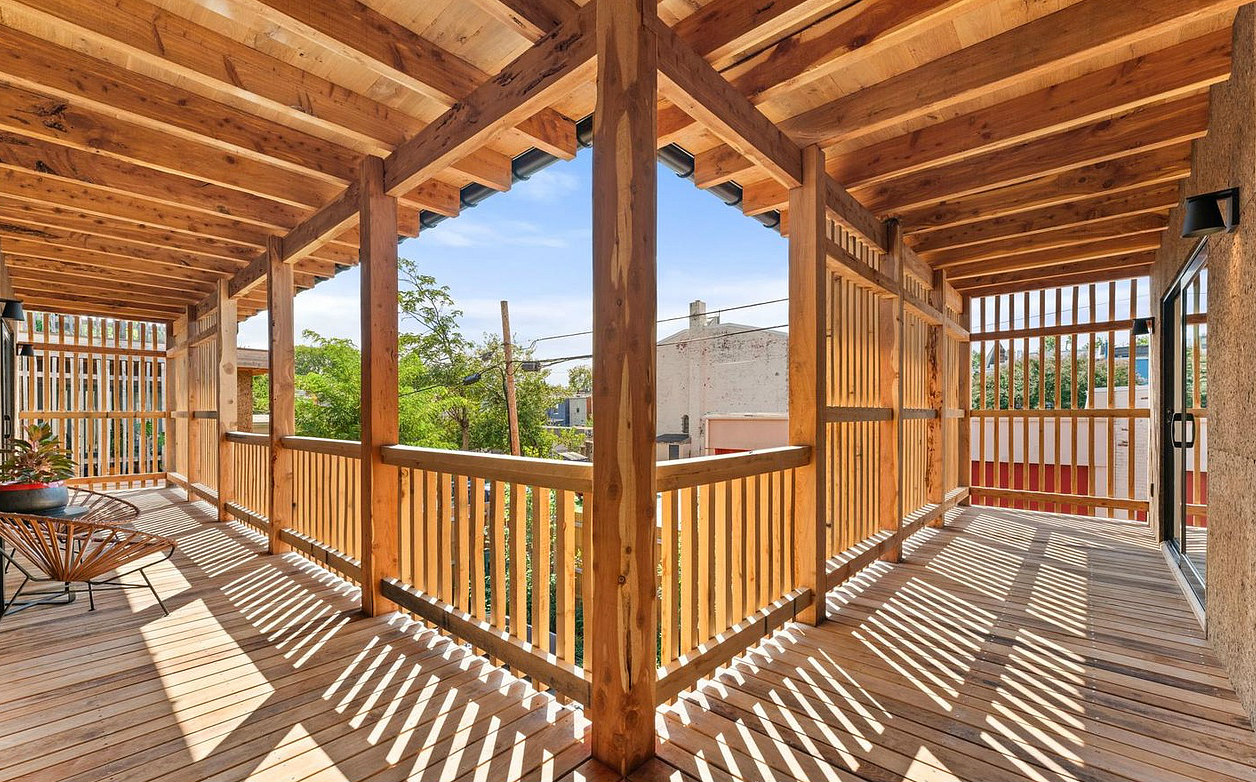 Sixty feet of double-decker covered balconies, supported by native Eastern Red Cedar timbers, overlook a landscaped private courtyard, where locally-sourced Maryland stone and black locust pavers create a foundation for native plantings. A BAM-CORE DuoShear™ building envelope and an insulated concrete slab foundation ensures a fully comfortable, energy-efficient, and clean/healthy living space.