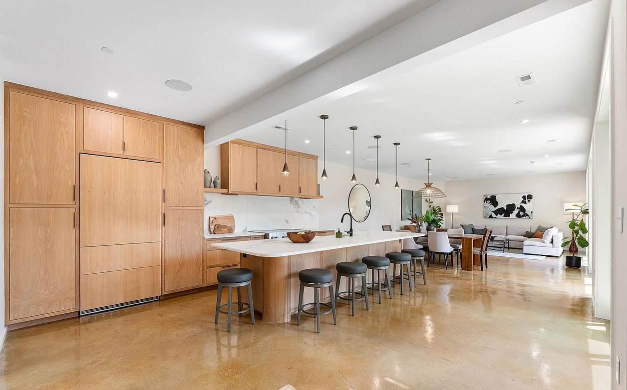The listing, designed by DC architect Jack Becker of BLDUS, has a striking horizontal profile and exterior siding of white oak, cork, and copper, behind which is a residence that seamlessly incorporates indoor/outdoor living.