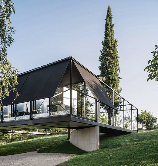- A steel house atop concrete pillars has pivoting doors to open to the Serbian countryside. — (S.L. Angelopoulou/designboom)