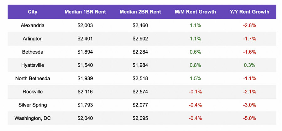 "Washington, DC rents went down 0.4% in the past month, compared to the national rate of 0.2%," the report stated. "Among the nation's 100 largest cities, this ranks #95. Similar monthly rent growth took place in Newark, NJ (-0.3%) and Milwaukee, WI (-0.6%)."